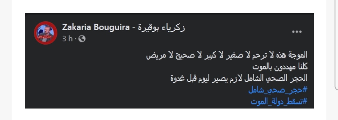 وفي تدوينة له على الفايسبوك، أكد زكرياء بوقيرة أن ‘هذه الموجة لا ترحم لا صغير لا كبير لا صحيح لا مريض’.
