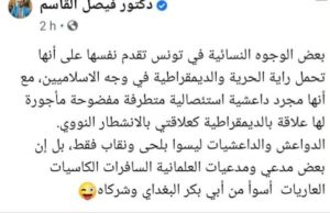 المنبر التونسي (فيصل القاسم) – ردا على الممثلة أمال السماوي، كتب فيصل القاسم ” بعض النساء الحداثيات في تونس علاقتها بالديمقراطية مثل علاقتي بالانشطار النووي.