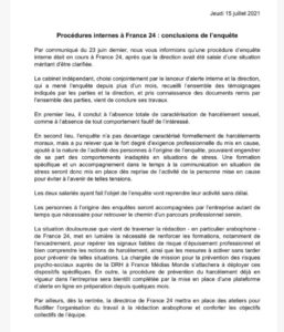 المنبر التونسي(توفيق مجيد) – أعلنت ادارة “فرانس ميديا موند” اليوم الخميس جويلية 2021 أن التحقيق الدي كلفت مكتبا خارجيا مستقلا باجرائه اثر إخطار ادارة “فرانس 24” بحالة تستحق التوضيح أفضى الى غياب أية سمة من سمات الهرسلة الجنسية (بالنسبة لمدير الأخبار) تماما مثل غياب أي سلوك مخطئ من طرف المستهدف بالاخطار .