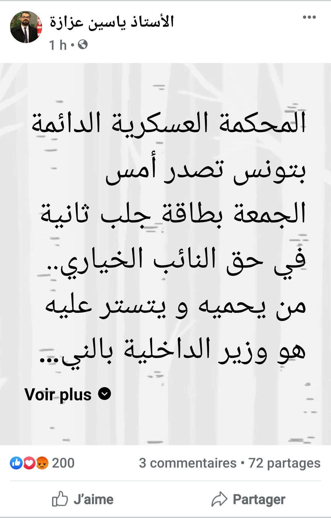 المنبر التونسي (راشد الخياري) – اصدرت امس الجمعة 16 جويلية2021، المحكمة العسكرية الدائمة بتونس بطاقة جلب ثانية في حق النائب بالبرلمان راشد الخياري، وفق ما نشره المحامي ياسين عزازة في تدوينة له على صفحته الرسمية فيسبوك
