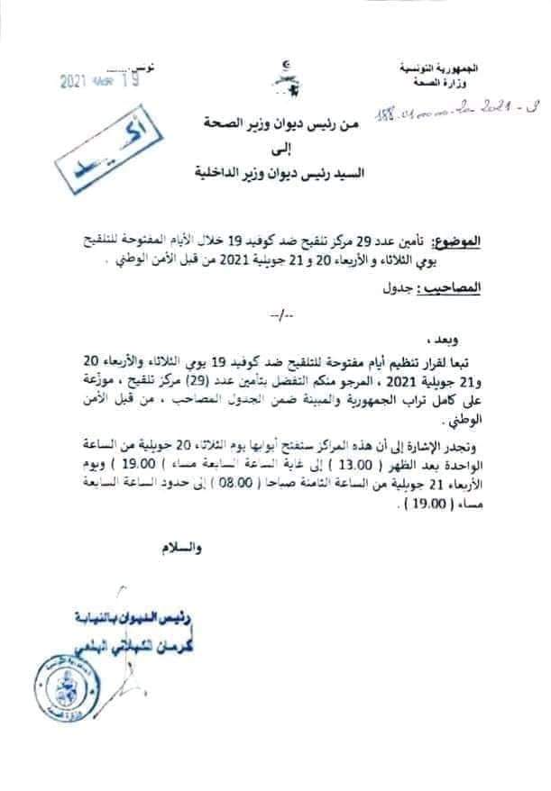 المنبر التونسي (وزارة الداخلية) – انتشرت منذ ليلة أمس الأربعاء 21 جويلية 2021 الرسالة التي وجهتها وزارة الصحة الى وزارة الداخلية يوم الاثنين 19 جويلية 2021 لإعلامها بتنظيم الأيام المفتوحة الخاصة بالتلقيح يومي الثلاثاء و الأربعاء 20 و 21 جويلية 2021 و دعت وزارة الصحة في هذه البرقية الى تأمين مراكز التلقيح الموزعة على مختلف ولايات الجمهورية :” المرجو منكم التفضل بتأمين عدد 29 مركز موزعة على كامل الجمهورية ومن قبل الامن الوطني ” .