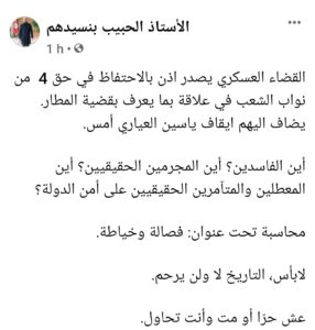 المنبر التونسي (نواب الشعب) – اكد الحبيب بن سيدهم النائب عن ائتلاف الكرامة في تدوينة له على الفايسبوك إصدار القضاء العسكري الاذن بالاحتفاظ في حق 4 نواب في علاقة بما يعرف بقضية المطار.