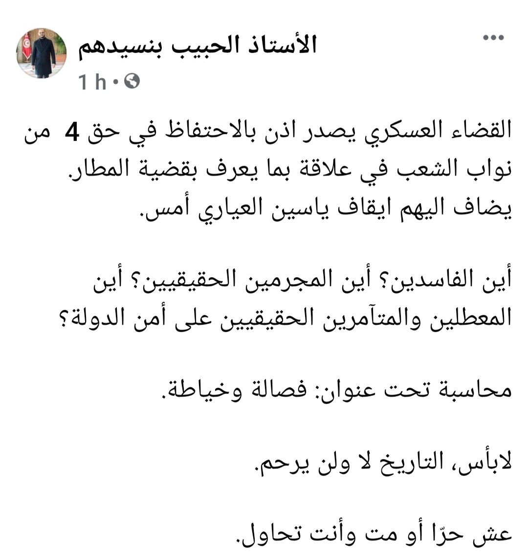 المنبر التونسي (نواب الشعب) – اكد الحبيب بن سيدهم النائب عن ائتلاف الكرامة في تدوينة له على الفايسبوك إصدار القضاء العسكري الاذن بالاحتفاظ في حق 4 نواب في علاقة بما يعرف بقضية المطار.