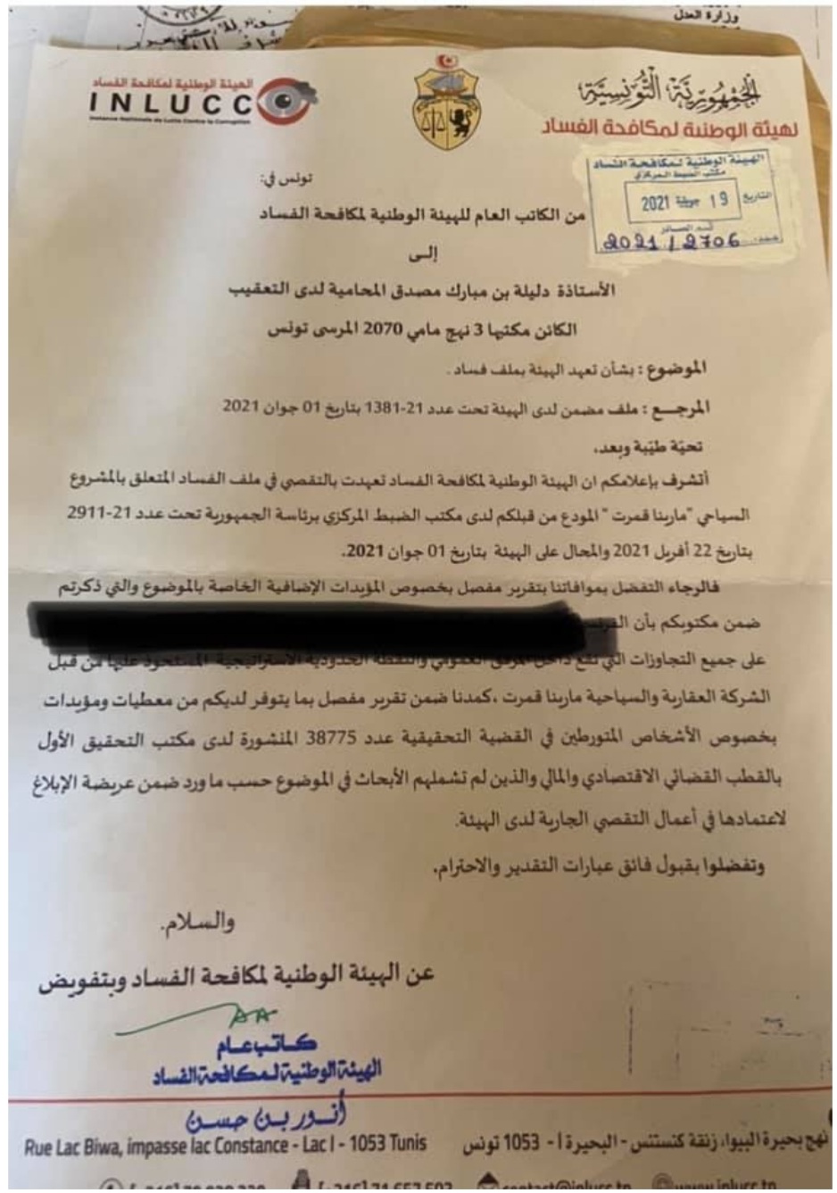 “احالة الملف من قبل رئاسة الجمهورية وفتح تحقيق لدى الهيئة الوطنية لمكافحة الفساد في خصوص ملف الفساد المتعلق بمارينا قمرت.