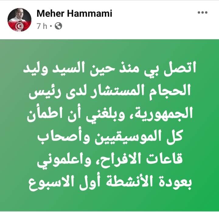 المنبر التونسي (ماهر الهمامي) – اعلن ماهر الهمامي نقيب الفنانين التونسيين عن عودة الحفلات والأعراس أول الأسبوع المقبل.