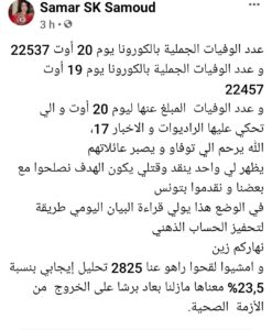 وأضافت الدكتورة سمر صمود، في تدوينة على حسابها بموقع التواصل الاجتماعي فايسبوك :”عدد الوفيات الجملية بالكورونا يوم 20 أوت 22537 و عدد الوفيات الجملية بالكورونا يوم 19 أوت 22457 و عدد الوفيات المبلغ عنها ليوم 20 أوت و الي تحكي عليها الراديوات و الاخبار 17″. وأضافت:” امشيوا لقحوا راهو عنا 2825 تحليل إيجابي بنسبة 23,5% معناها مازلنا بعاد برشا على الخروج من الأزمة الصحية”.