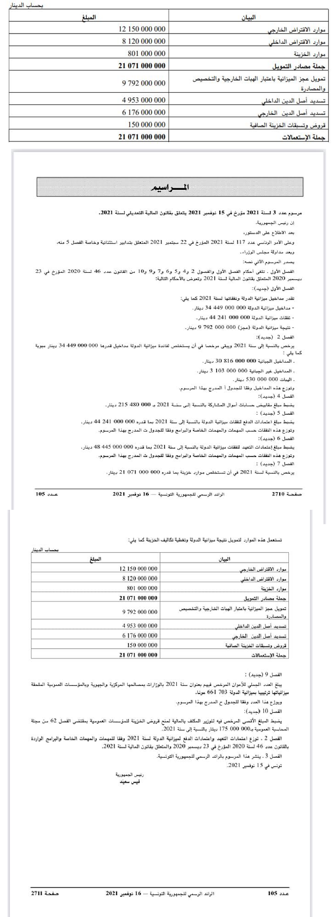 يرخص بالنسبـة لسنة 2021 في أن تسـتخلص مـوارد خزينة بما قدره 000 000 071 21 دينار.