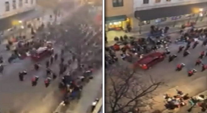 وفي الفيديو المعروض أعلاه، وهو مموّه بعض الشيء ليسمح “يوتيوب” بعرضه، نرى السيارة الحمراء تقتحم العرض، وتدهس ما يمكن من الأشخاص، ثم تمضي وسط أكثر من 10 أشخاص قبل وفود حشود من على الأرصفة لتقديم المساعدة.