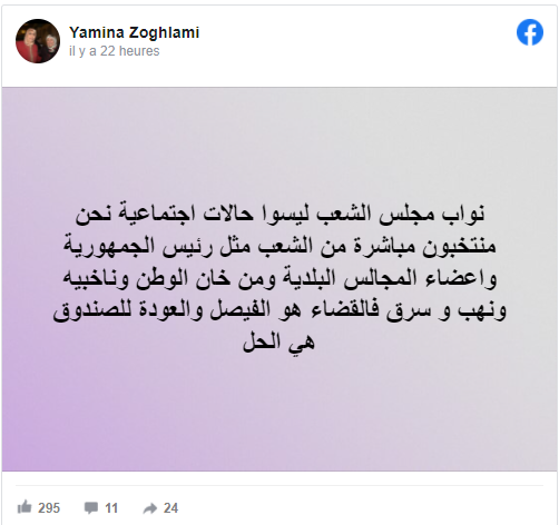 وأضافت يمينة الزغلامي في تدوينة على حسابها بموقع التواصل الاجتماعي فايسبوك “من خان الوطن وناخبيه ونهب و سرق فالقضاء هو الفيصل والعودة للصندوق هي الحل “.