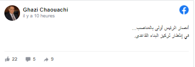 وأضاف غازي الشواشي في تدوينة على حسابه بموقع التواصل الاجتماعي فايسبوك “في انتظار تركيز البناء القاعدي “.