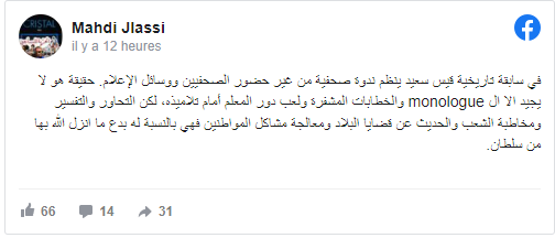 وأضاف في تدوينة على حسابه الشخصي على موقع فايسبوك “حقيقة هو لا يجيد الا ال monologue والخطابات المشفرة ولعب دور المعلم أمام تلاميذه، لكن التحاور والتفسير ومخاطبة الشعب والحديث عن قضايا البلاد ومعالجة مشاكل المواطنين فهي بالنسبة له بدع ما انزل الله بها من سلطان”.