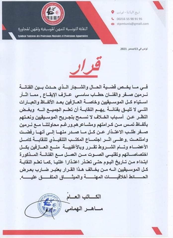 المنبر التونسي (نرمين صفر) – أصدرت النقابة التونسية للمهن الموسيقية والمهن المجاورة قرارا يتعلق بنرمين صفر.