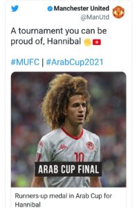 وجاء في نص التدوينة:”ربما تكون أكبر مباراة في مسيرة حنبعل المزدهرة حتى الآن، رغم أنها انتهت بخيبة أمل للاعب خط وسطنا الشاب، لكنه سيعود إلى الفريق بميدالية الوصيف في كأس العرب”.