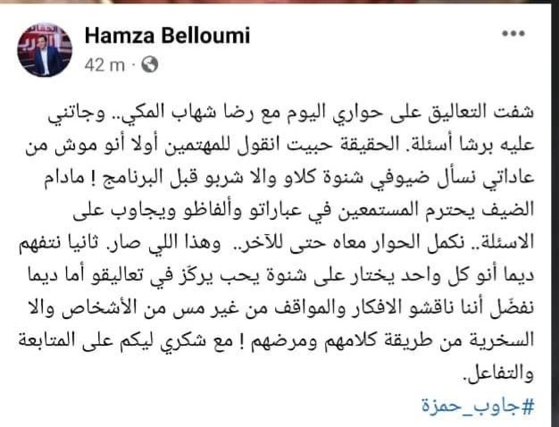 المنبر التونسي (حمزة البلومي) – علق الإعلامي حمزة البلومي على منتقدي استضافته لرضا شهاب المكي في برنامج جاوب_حمزة.