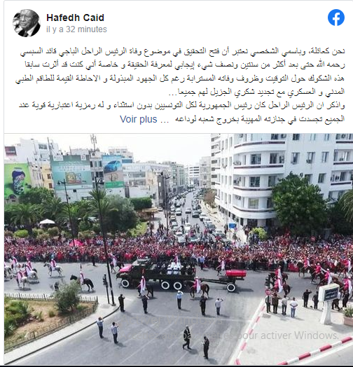 وأضاف حافظ قائد السبسي أنه كان قد أثار سابقا هذه الشكوك حول التوقيت وظروف وفاته المسترابة رغم كل الجهود المبذولة و الإحاطة القيمة للطاقم الطبي المدني والعسكري”.