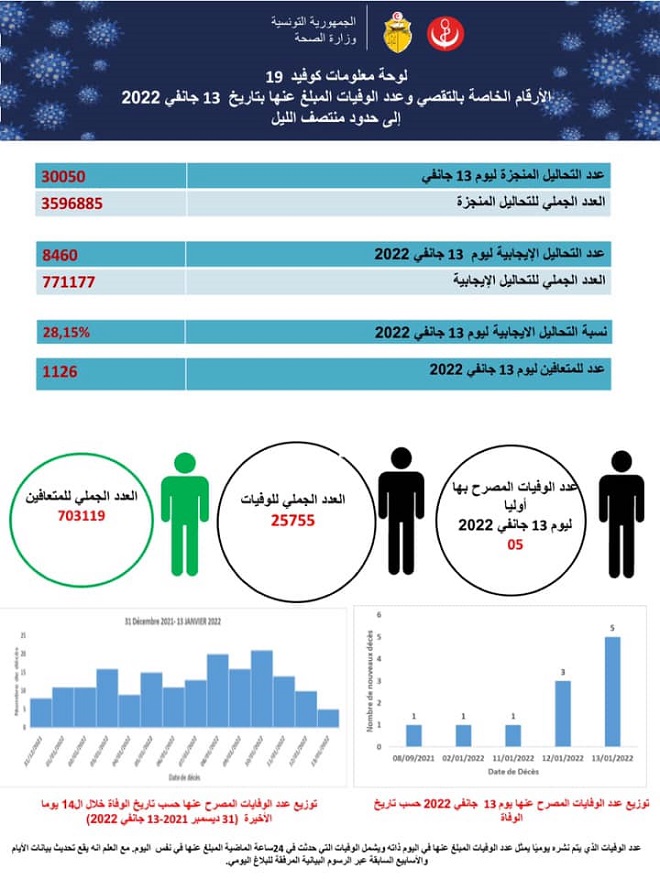 المنبر التونسي (كورونا) –  أعلنت وزارة الصحة، في بلاغ لها مساء يوم الجمعة 14 جانفي 2022، عن تسجيل خمس حالات وفاة جراء فيروس كورونا، تم التصريح بها أوليا بتاريخ يوم الخميس 13 جانفي 2022، و8460 تحليلا إيجابيا من مجموع 30050 تحليلا مخبريا، لترتفع بذلك نسبة التحاليل الإيجابية إلى 28.15%.