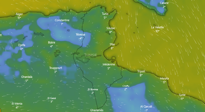وتتراوح الحرارة ليلا بين 5 و10 درجات وتكون في حدود 2 بالمرتفعات الغربية، وتكون الرياح معتدلة عموما والبحر متموج.