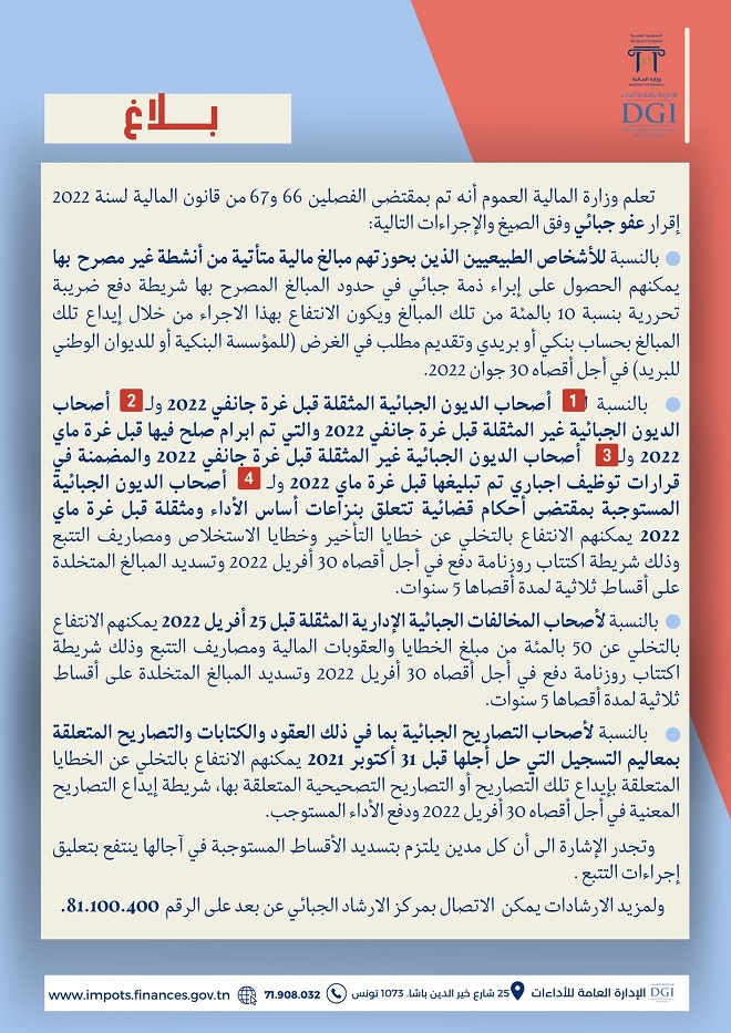 المنبر التونسي (العفو الجبائي) – أفادت الإدارة العامّة للأداءات تونس، في بلاغ أصدرته اليوم الخميس 27 جانفي 2022، أن وزارة المالية أقرت، بمقتضى الفصلين 66 و67 من قانون المالية لسنة 2022، عفوا جبائي وفق الصيغ والاجراءات التالية:
