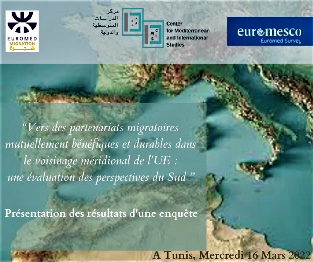 وارتكز اللقاء الحواري على الدراسة الاستقصائية التي أعدّها المعهد الأوروبي للبحر الأبيض المتوسط (IEMed) في إطار مشروع “EuroMeSCo Connecting the dots” بالشراكة مع المركز الدولي لتطوير سياسات الهجرة (ICMPD) في إطار مشروع “EuroMed Migra tion 5″ وذلك بهدف التفكير في شراكات الهجرة بين الاتحاد الأوروبي ودول البحر الأبيض المتوسط. وخاصة مع دول جنوب المتوسط في اطار الشراكة والميثاق الجديد للهجرة و اللجوء والشراكة القائمة بين ضفتي المتوسط.