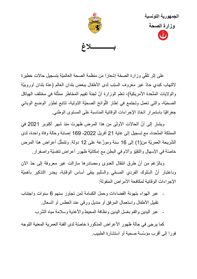 المنبر التونسي (إصابات خطيرة لالتهاب كبدي) – اصدرت وزارة الصحة اليوم الجمعة بلاغا اكدت فيه تلقيها اشعارا من منظمة الصحة العالمية بتسجيل حالات اصابة خطيرة لالتهاب كبدي حاد غير معروف السبب لدى الاطفال ببعض بلدان العالم على غرار عدة دول اوروبية والولايات المتحدة الامريكية.