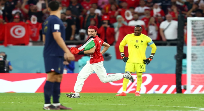 المنبر التونسي (العلم الفلسطيني) – اقتحم مشجّع تونسي الملعب مباشرة اثر نهاية مقابلة المنتخب الوطني ونظيره الفرنسي.