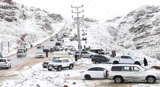 ونشر المتابعون مقاطع الفيديو على “تويتر”، الذي يُظهر تساقط ثلوج على جبل اللوز في تبوك، منذ يوم الأحد الماضي.
