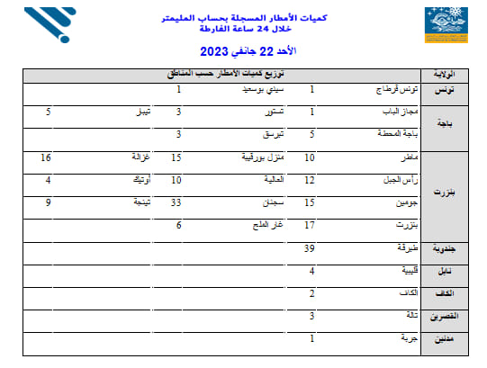 المنبر التونسي (كميات الأمطار) – سجل المعهد الوطني للرصد الجوي خلال الأربع وعشرين ساعة الأخيرة تهاطل كميات متفاوتة من الأمطار حيث سُجّلت أعلى كميات في طبرقة من ولاية جندوبة فقد بلغت 39 مم تليها مدينة سجنان من ولاية بنزرت بـ33 مم.