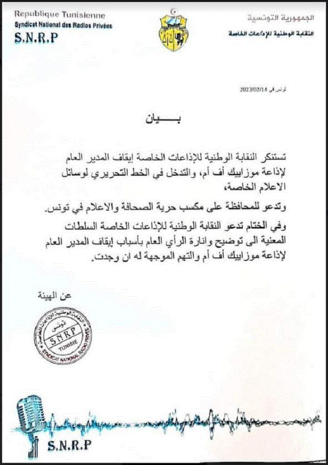 المنبر التونسي (إيقاف مدير عام موزاييك أف أم) – عبرت النقابة الوطنية للإذاعات الخاصة في بيان عن استنكارها إيقاف المدير العام لإذاعة موزاييك أف أم والتدخل في الخط التحريري لوسائل الإعلام الخاصة، داعية إلى المحافظة على مكسب حرية الصحافة والإعلام في تونس.