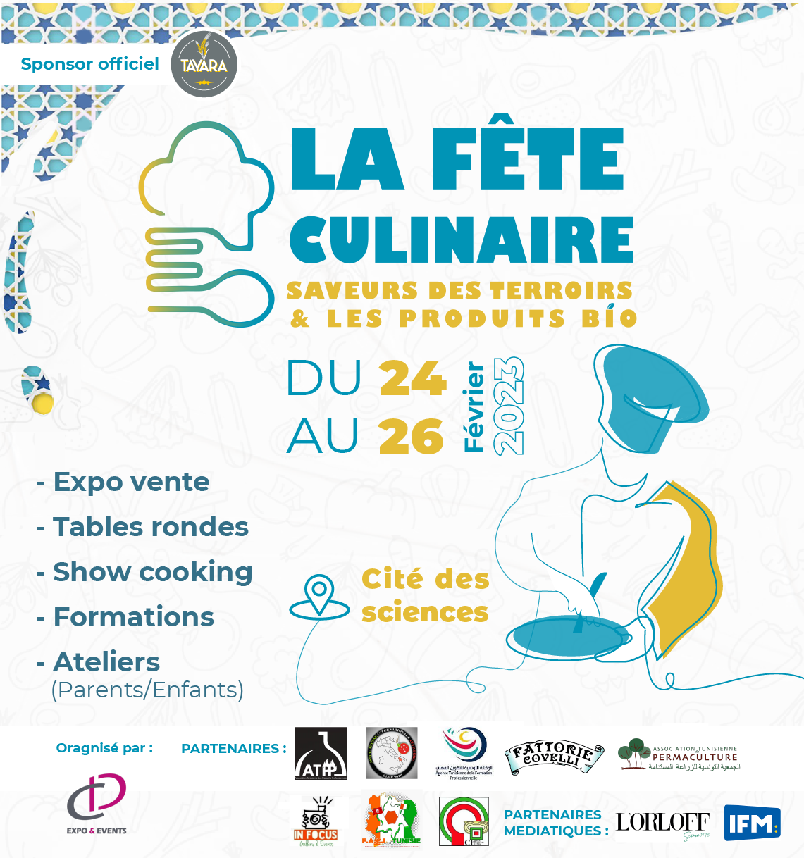 المنبر التونسي (حفلة الطهي) – في إطار ترويج وتعزيز المنتجات المحلية والمنتجات الغذائية الزراعية التونسية والمشاريع المبتكرة في مجال الطهي، تنضم ‘إي دي سي اكسبو’ الدورة الثانية لحفلة الطهي في مدينة العلوم ، بداية من يوم الجمعة 24 فيفري إلى يوم الأحد 26 فيفري 2023.