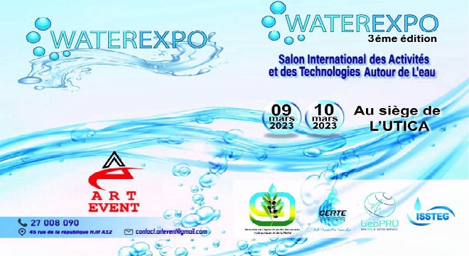 المنبر التونسي (الصالون الدولي للأنشطة والتكنولوجيات المائية) – تحت إشراف وزارة الفلاحة والموارد المائية والصيد البحري، تنظّم شركة ART EVENT بالشراكة مع مركز بحوث وتكنولوجيات المياه ” الصالون الدولي للأنشطة والتكنولوجيات المائية” في دورته الثالثة WATER EXPO 2023 أيام 09 و 10 مارس 2023 بمقرّ الاتحاد التونسي للصناعة والتجارة والصناعات التقليدية.