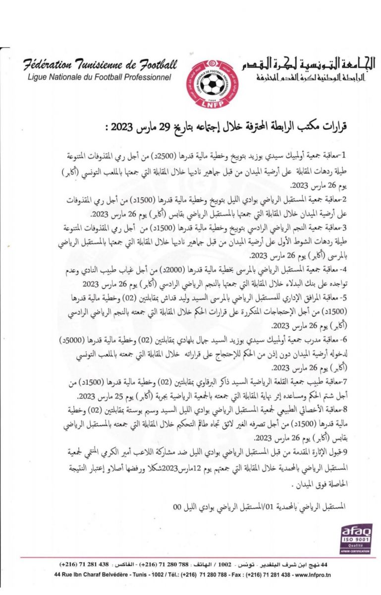 المنبر التونسي (جملة من العقوبات ضد بعض الأندية) – أصدرت الرابطة الوطنية لكرة القدم المحترفة اليوم الأربعاء جملة من العقوبات، طالت عدة فرق من الرابطة المحترفة الأولى والثانية، بعد مباريات الجولة الثالثة من مرحلة تفادي النزول و الجولة 15 من الرابطة المحترفة الثانية.