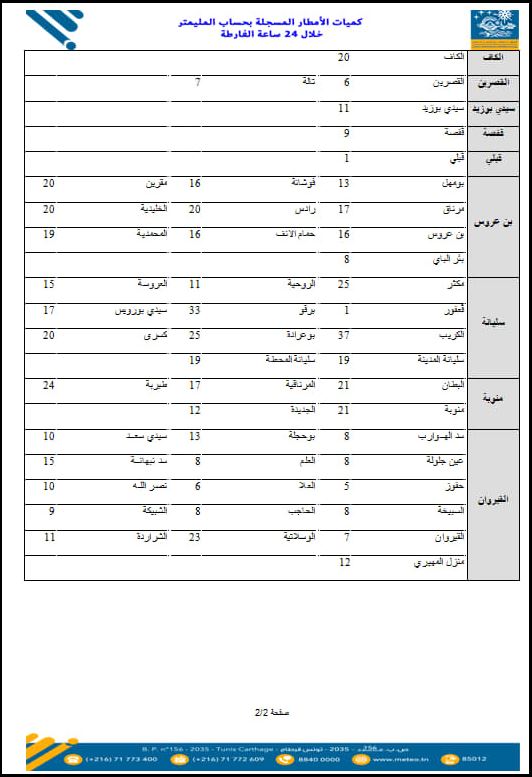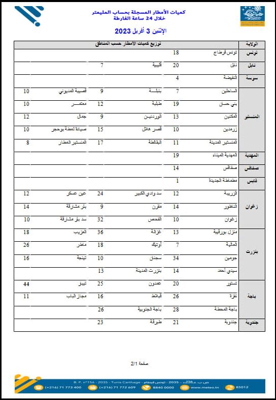المنبر التونسي (كميات الأمطار المسجّلة) – شهدت عدة مناطق خلال الساعات الأخيرة، نزول كميات هامّة من الأمطار، ونشر المعهد الوطني للرصد الجوي على صفحته الرسمية بموقع التواصل الاجتماعي فيسبوك الاثنين 3 أفريل 2023 قائمة لأهم الكميات المسجلة في جهات مختلفة خلال الـ24 ساعة الأخيرة.