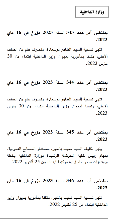 المنبر التونسي (رئيس ديوان وزير الداخلية) – صدر في العدد الأخير من الرائد الرسمي للجمهورية التونسية بتاريخ أمس الجمعة 19 ماي 2023 جملة من الأوامر والقرارات تتعلق بإنهاء مهام مسؤولين بوزارة الداخلية وبتسميات جديدة صلب نفس الوزارة.