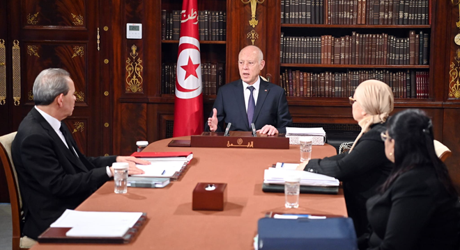 المنبر التونسي (تنقيح مرسوم الصلح الجزائي) – عقد رئيس الجمهورية قيس سعيد، ظهر اليوم الثلاثاء 19 ديسمبر 2023، جلسة عمل مع أحمد الحشاني ، رئيس الحكومة، ومع ليلى جفال، وزيرة العدل وسهام بوغديري نميصة، وزيرة المالية.