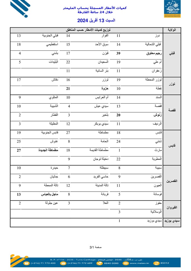 ونشر المعهد الوطني للرصد الجوي اليوم السبت 13 أفريل القائمة النهائية لكميات الأمطار خلال الـ24 ساعة الفارطة، حيث شهدت أغلب ولايات ومناطق الجمهورية كميات متفاوتة تراوحت بين 1 مم و39 مم.