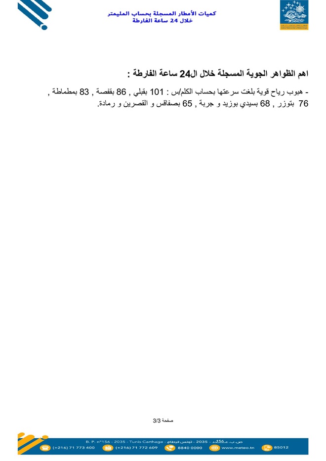 المنبر التونسي (كميات الأمطار) – سجلت منطقة رجيم معتوق بولاية قبلي، أعلى كميات من الأمطار خلال الـ24 ساعة الماضية بـ39 مم.
