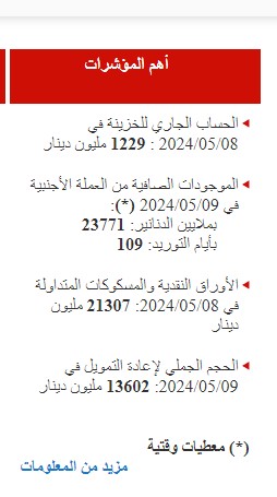 وحسب آخر معطيات ومؤشرات نشرها البنك المركزي التونسي، فإن قيمة الحساب الجاري للخزينة في 8 ماي بلغت 1229 مليون دينار.