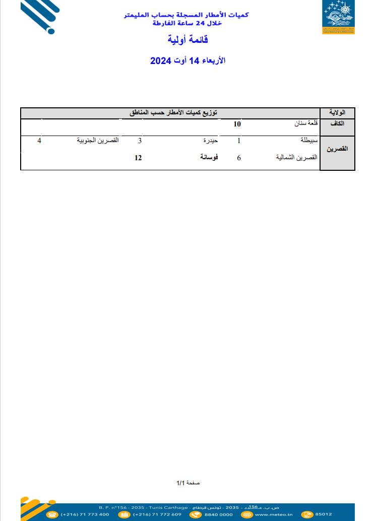 المنبر التونسي (الأمطار) – سجلت بعض المناطق بالبلاد هطول كميات متفاوتة من الأمطار خلال الـــ24 ساعة الماضية وفق نشرة للمعهد الوطني للرصد الجوي اليوم الأربعاء 14 أوت 2024.