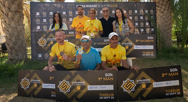 المنبر التونسي (تأمينات BIAT والترا ميراج الجريد) – اختتم ماراطون الترا ميراج الجريد 2025 فعاليات دورته التاسعة من بحيرة شمسة التابعة لمدينة توزر يوم السبت 27 سبتمبر 2025 بمشاركة محلية ودولية واسعة جمعت 500 مشارك من 29 جنسية مختلفة من القارات الخمس، ممّا يرسخ مكانة هذا السباق كأحد أبرز سباقات التحمل في افريقيا وفي العالم.