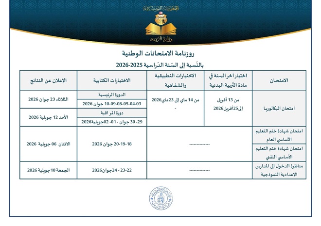وبخصوص امتحان شهادة ختم التعليم الأساسي العام والتقني فسينتظم أيام 18 و19 و20 جوان على ان يتم الإعلان عن النتائج يوم 6 جويلية 2026.