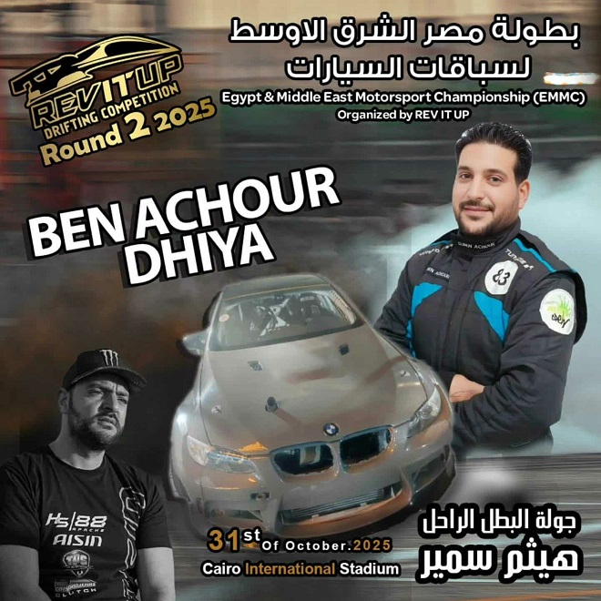 المنبر التونسي (ضياء بن عاشور) – شارك المنتخب الوطني للدريفت ممثلا بالسائق المحترف ضياء بن عاشورب بطولة “REV IT UP” بطولة سباقات سيارات مصر والشرق الأوسط و شمال افريقيا التي تجمع بين سباقات السرعة والدريفت، وتعد واحدة من أكبر البطولات في المنطقة و ذلك يوم الجمعة 31 أكتوبر 2025 بملعب القاهرة الدولي