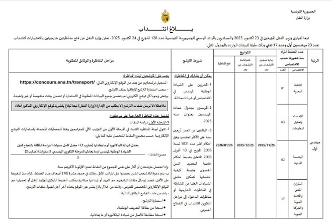 المنبر التونسي (وزارة النقل) – أعلنت وزارة النقل في بلاغ لها امس الإثنين 24 نوفمبر 2025 عن فتح مناظرتين خارجيتين بالاختبارات لانتداب 23 مهندسا أول و17 تقنيا.