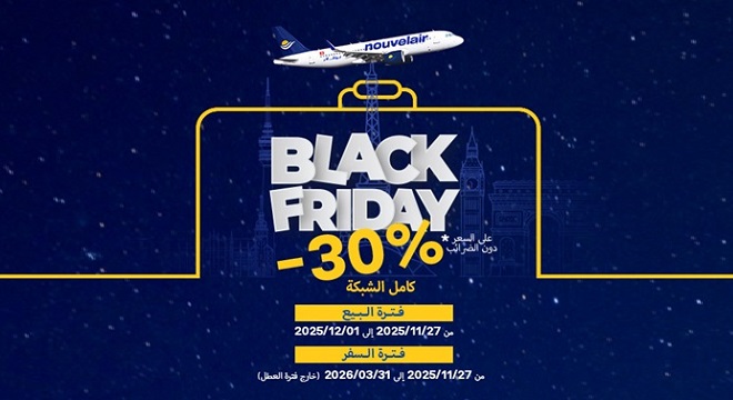 المنبر التونسي (نوفلار) – بمناسبة الـBlack Friday، تطلق نوفلار عرضا استنثنائيا يتمثل في تخفيض بنسبة 30% على السعر دون احتساب الضرائب لجميع الرحلات على كامل شبكتها انطلاقا من وإلى تونس.