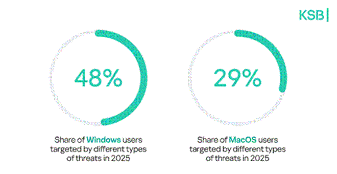 لا يزال نظام Windows الهدف الأبرز للهجمات السيبرانية. فقد استُهدف 48% من مستخدمي Windows بمختلف أنواع التهديدات طوال عام 2025. أما لدى مستخدمي Mac، فيبلغ هذا المؤشر 29%.