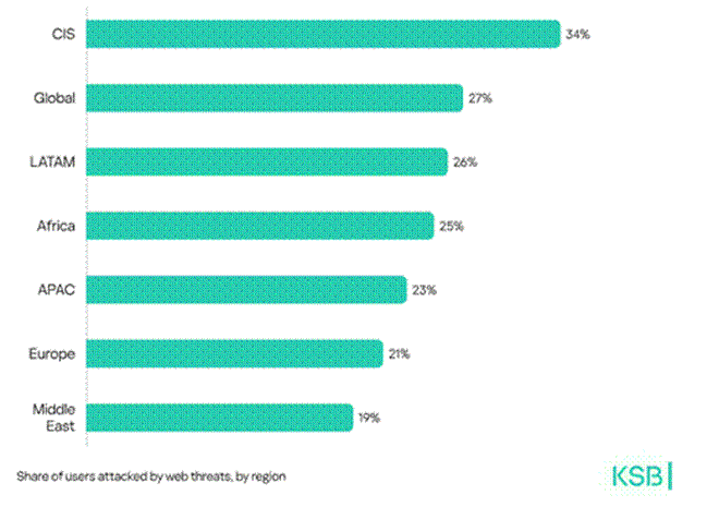 على الصعيد العالمي، تأثر 27% من المستخدمين بتهديدات الويب، وهي هجمات تستهدف مستخدمي الإنترنت أثناء التصفح. ورغم أن هذه البرمجيات الخبيثة لا ترتبط حصريًا بالنشاط عبر الإنترنت، فإنها تحتاج في مرحلة من مراحلها إلى استخدام الشبكة لإحداث الضرر.