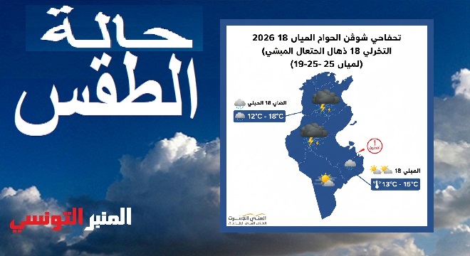 المنبر التونسي (توقعات الطقس) – يتميز طقس اليوم الأحد 18 جانفي 2026 بظهور سحب أحيانا كثيفة مع توقعات بنزول أمطار متفرقة ومؤقتا رعدية، خاصة في مناطق الوسط.