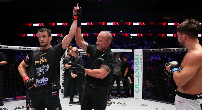 المنبر التونسي (نور محمدوف) – توّج المقاتل الروسي عثمان نور محمدوف بلقب الوزن الخفيف لرابطة المقاتلين المحترفين، بعد فوزه على البريطاني ألفي ديفيس بالإخضاع في الجولة الثالثة، خلال النزال الرئيسي لبطولة رابطة المقاتلين المحترفين التي استضافتها دبي مساء أمس في كوكاكولا أرينا.