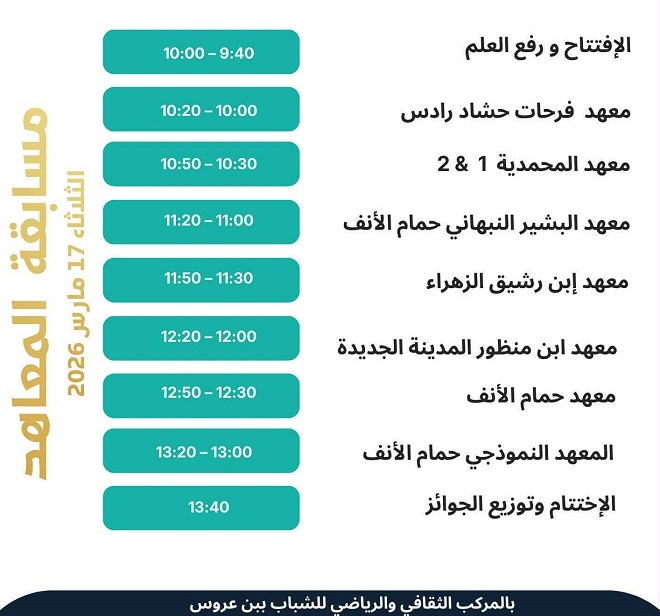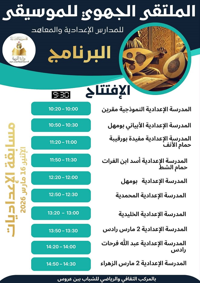 المنبر التونسي (الملتقى الجهوي للموسيقى) – تنظم المندوبية الجهوية للتربية ببن عروس يومي 16 و17 مارس 2026 ابتداءً من الساعة العاشرة صباحًا بالمركب الثقافي والرياضي للشباب ببن عروس، الملتقى الجهوي للموسيقى الخاص بالمدارس الإعدادية والمعاهد.