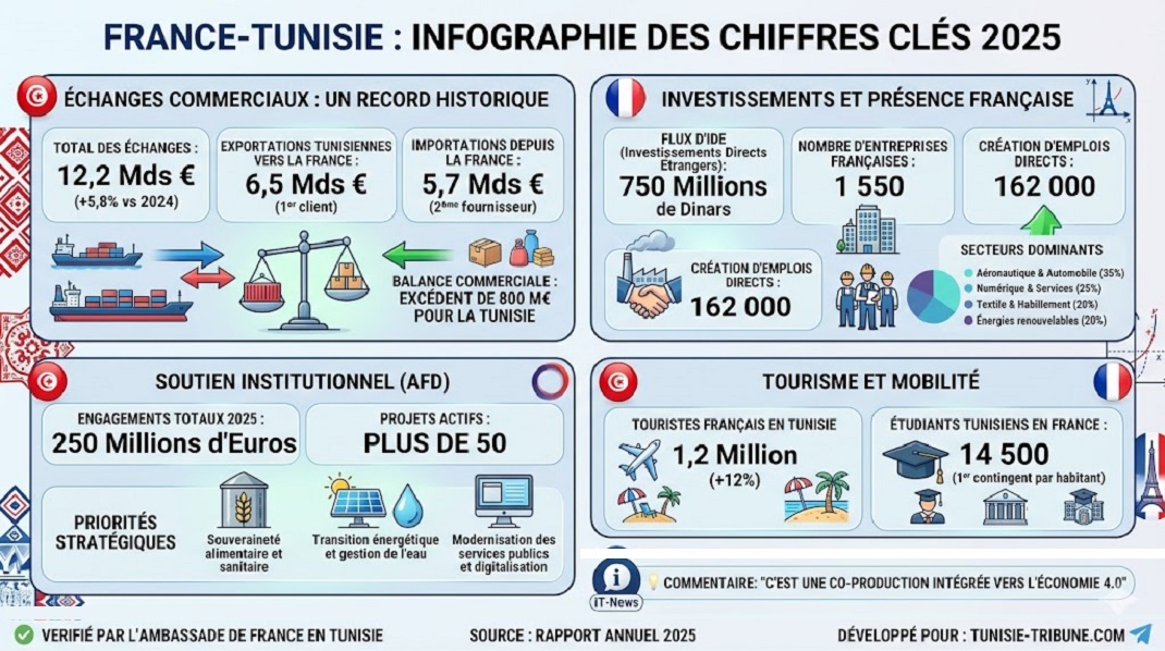 • عودة قوية للسياحة: استقبلت تونس 1.2 مليون سائح فرنسي في 2025، بزيادة قدرها 12%.