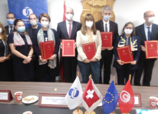 أشرف وزراء، الإقتصاد والتخطيط سمير سعيّد والصناعة والمناجم والطاقة نائلة نويرة ڤونجي على موكب تمّ خلاله التوقيع على اتفاقيتي هبتين بين تونس والبنك الأوروبي لإعادة الإعمار والتنمية